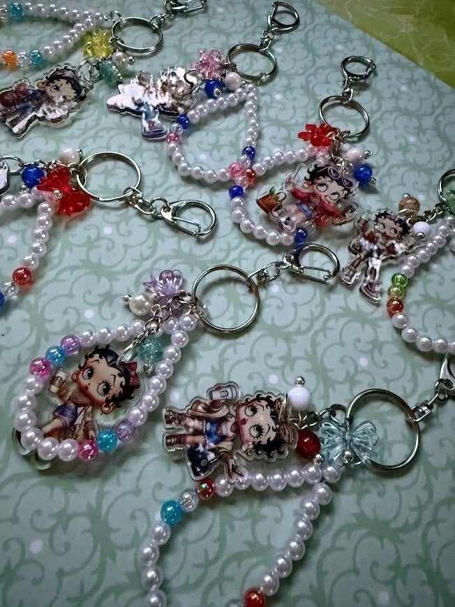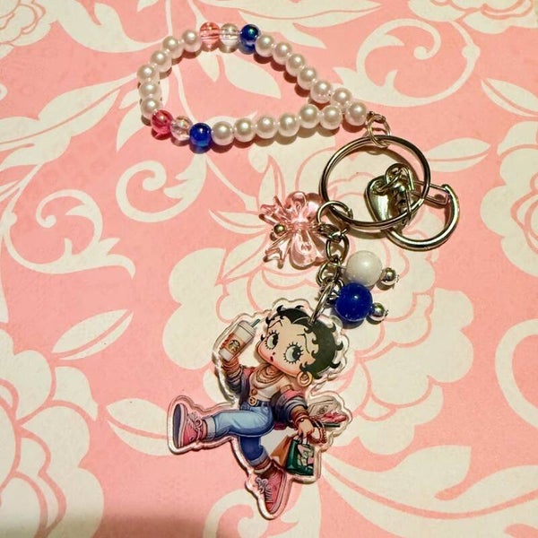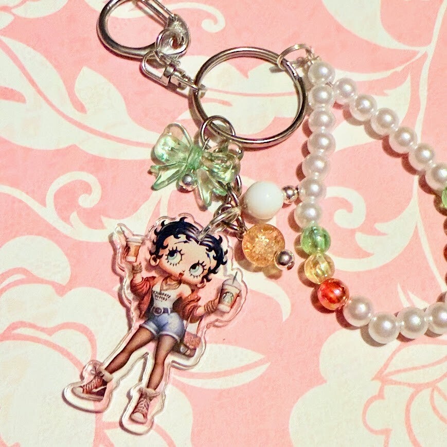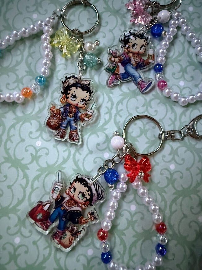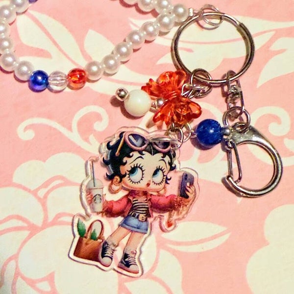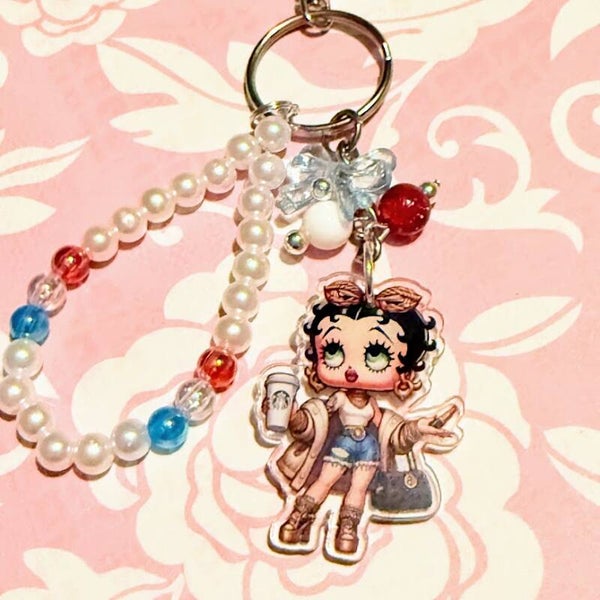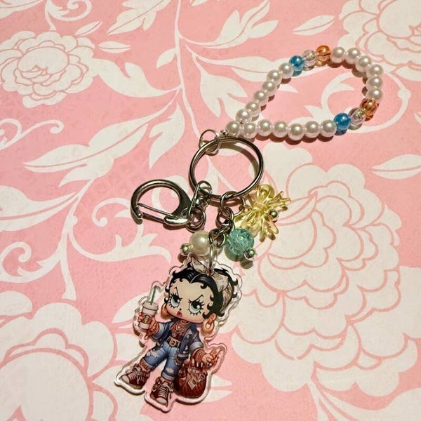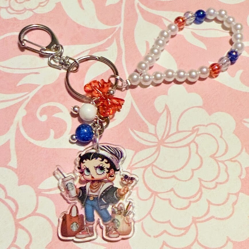 Add a touch of sass and retro flair to your everyday essentials with this handmade keychain featuring a stylish vintage cartoon girl! Betty Boop, Dressed in a modern outfit with sneakers, an iced coffee, and a trendy tote, she's the perfect blend of classic and current. Each keychain includes a beaded pearl loop accented with colorful beads and playful charms, making it an eye-catching accessory for your keys, purse, or backpack.